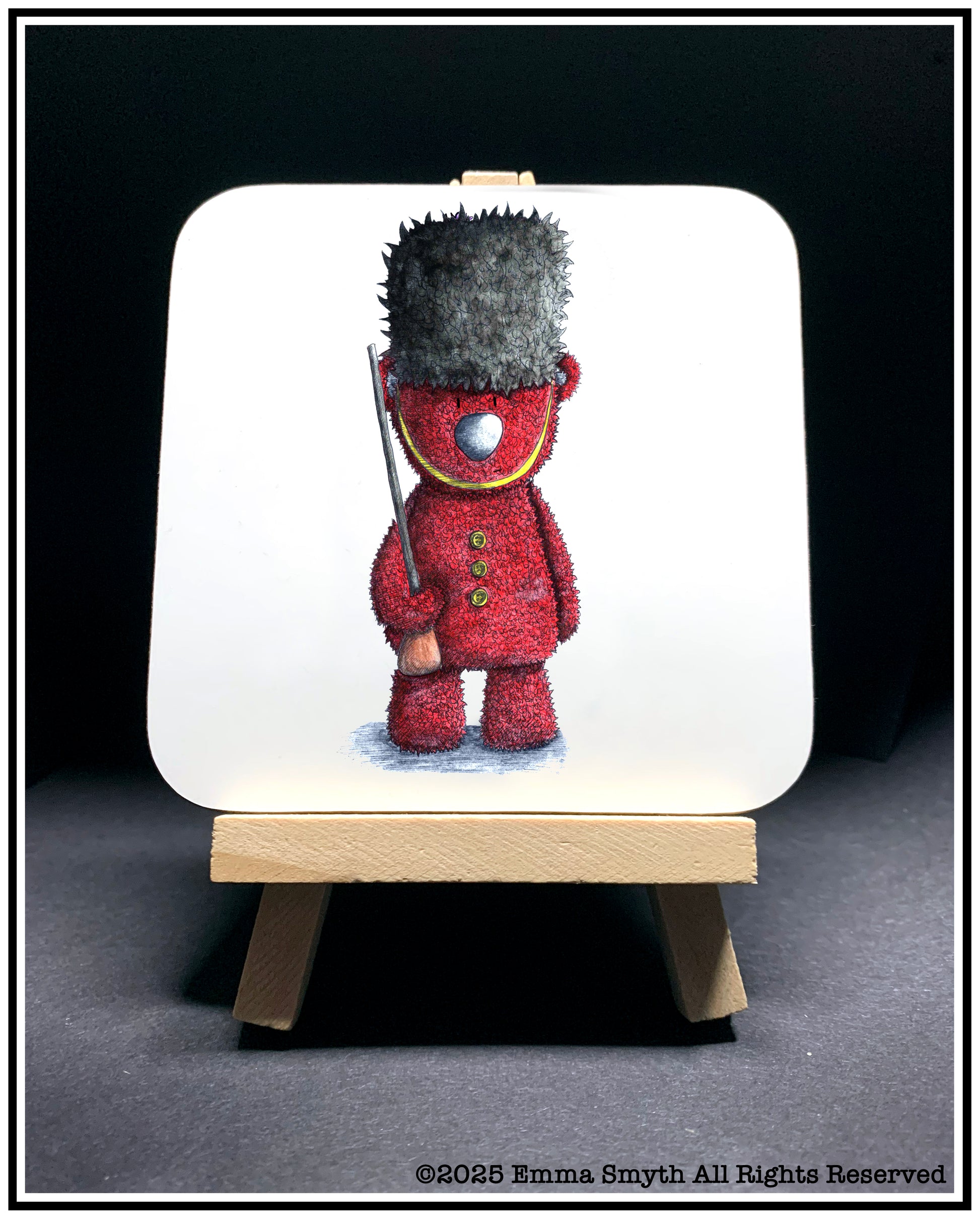 English Bear Coaster. This cute coaster can be stored as a mini piece of art in-between uses with its mini plastic stand (not shown).