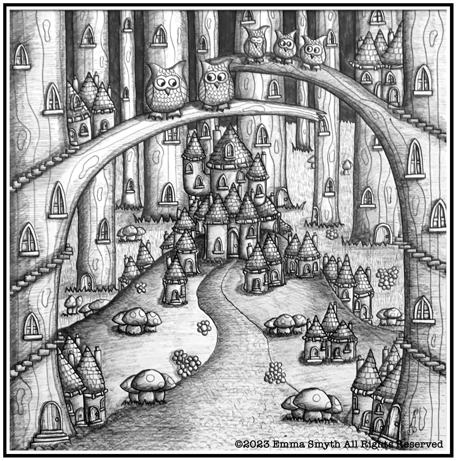 A new world awaits in the centre of the forest where mystery and magic are still alive. A pen and ink illustration of what we can't see.