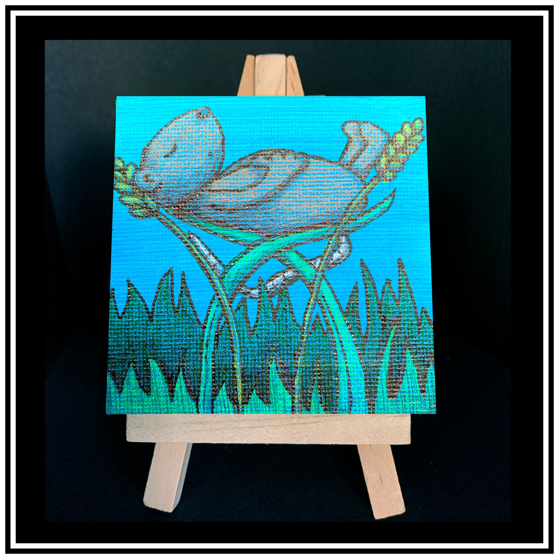 Colourful mini mixed media Canvas, pen and ink and acrylic. A little field mouse takes a nap in the long summer grass.